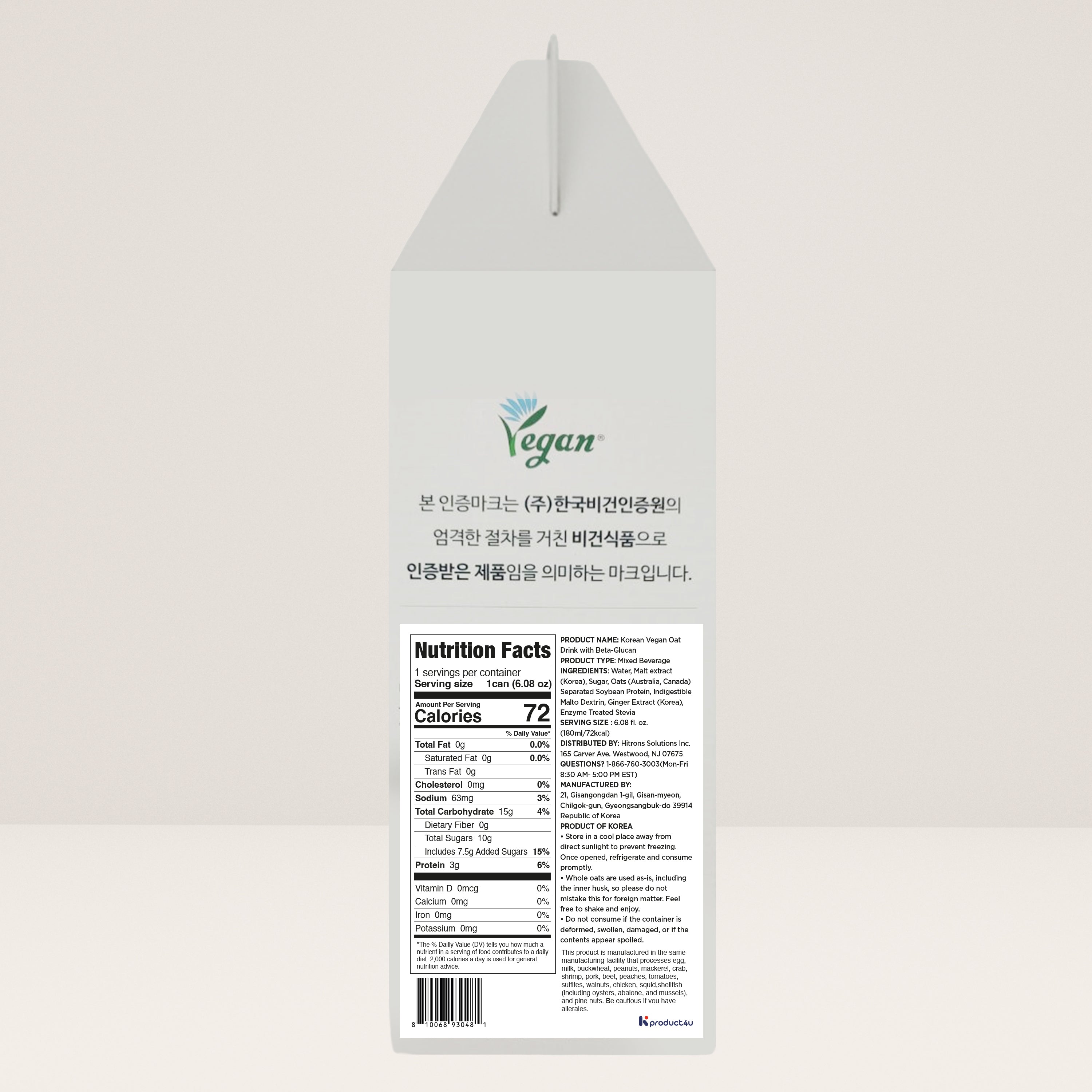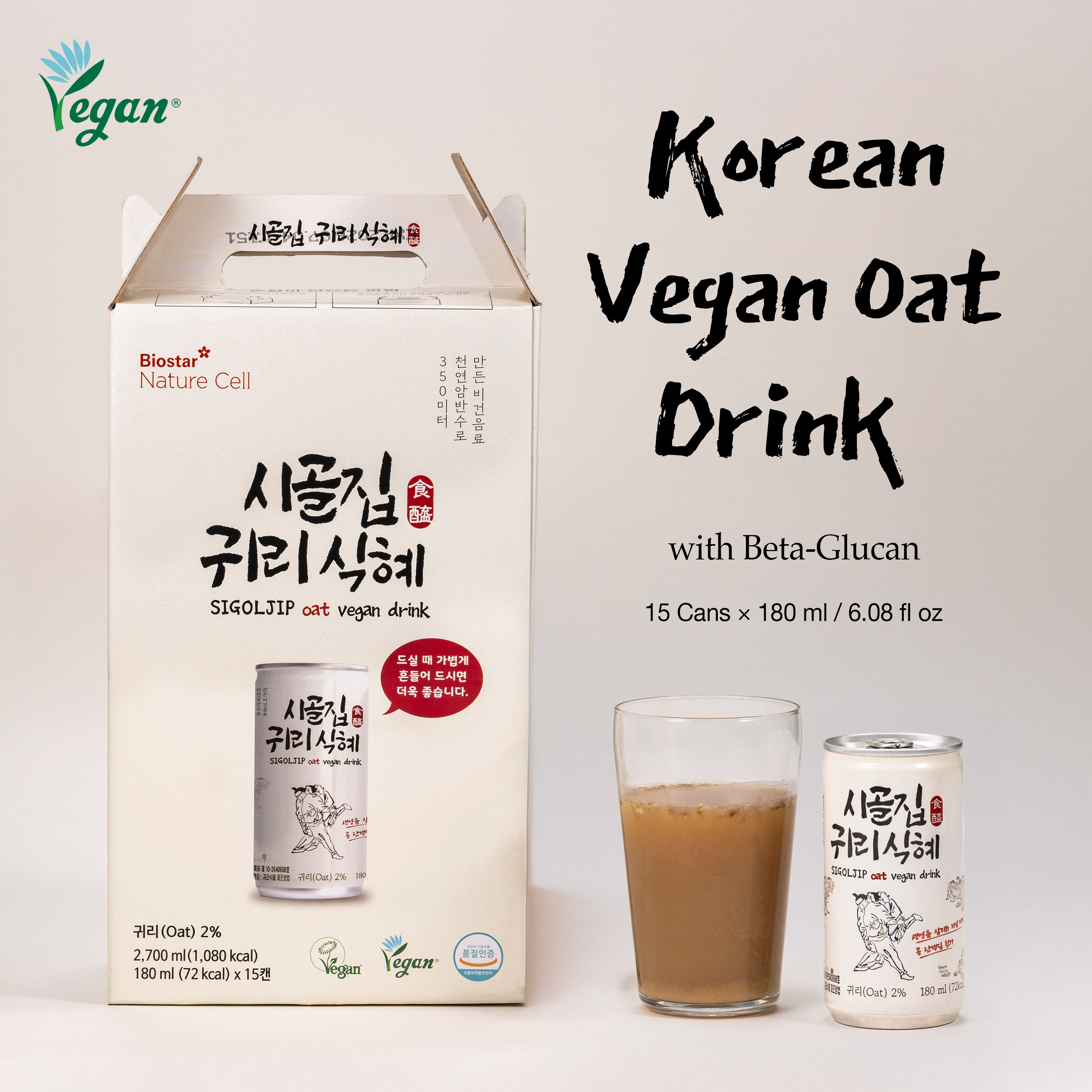 Korean Vegan Oat Drink with Beta-Glucan – Plant-Based Protein & Cholesterol Support (15 Cans × 180 ml / 6.08 fl oz)